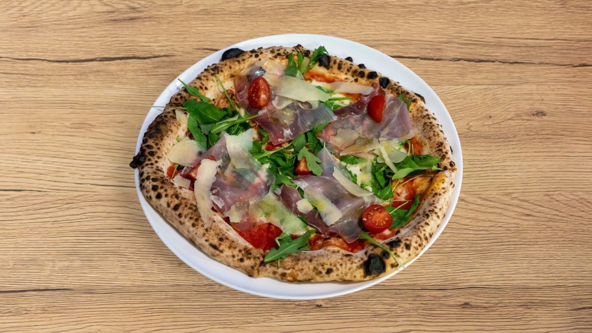 paradicsom, mozzarella fior di latte, Pármai sonka, rukkola, parmezán D.O.P., koktel paradicsom ,extra szűz olívaolaj