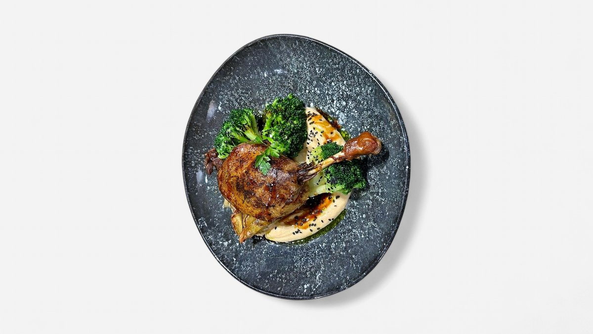 Konfitált kacsacomb, narancsos mártás, polenta, lilakáposzta