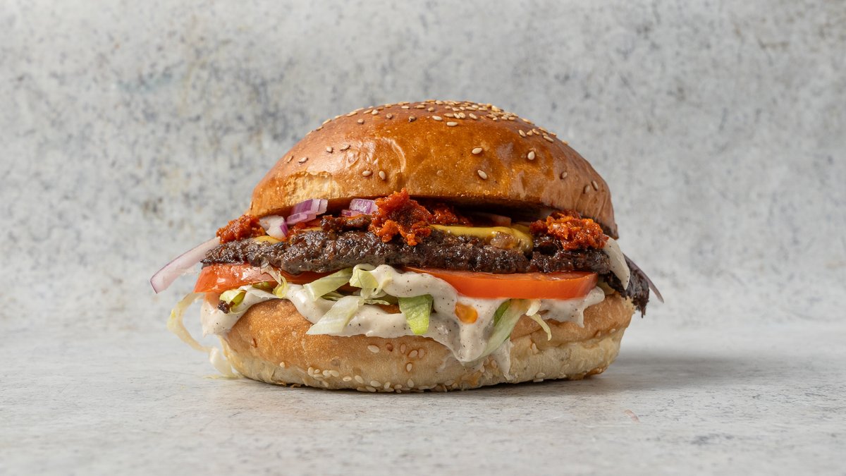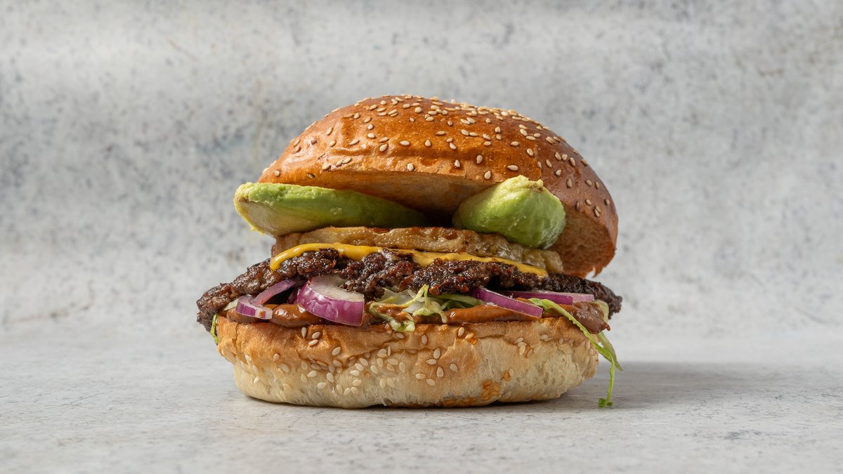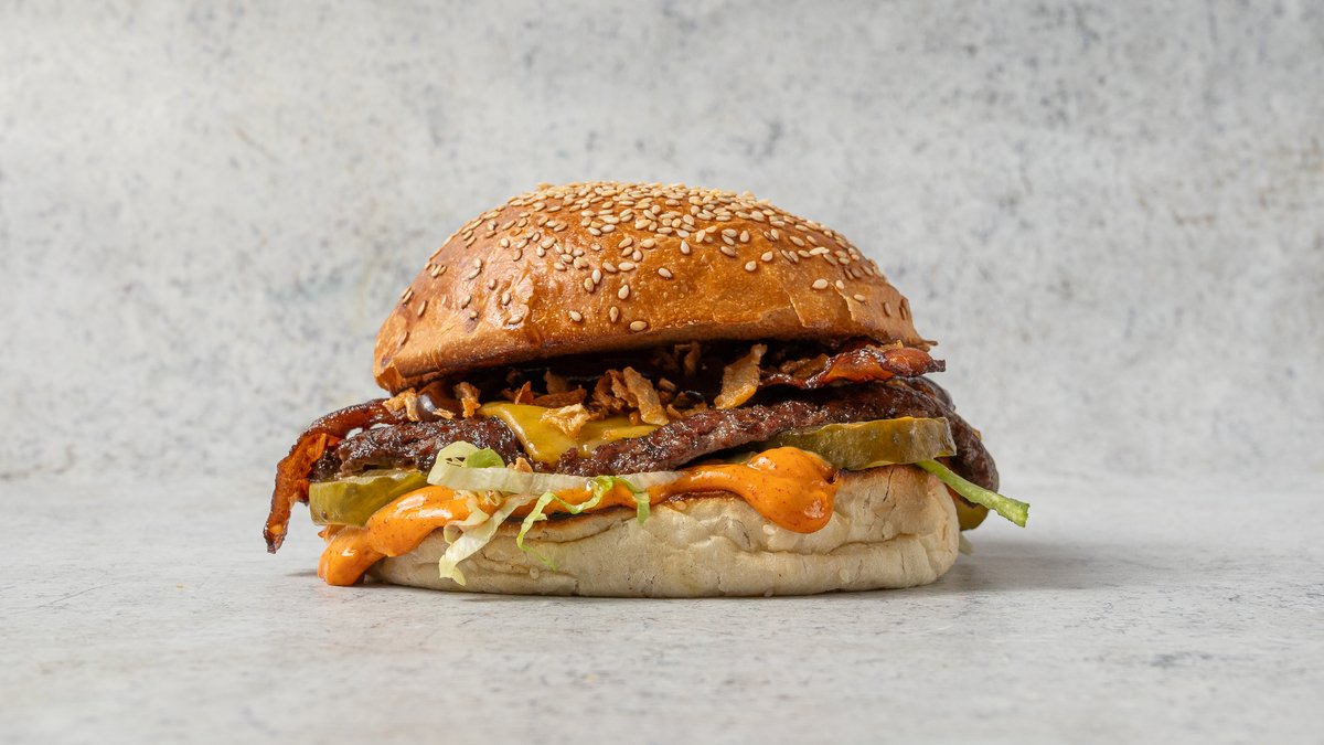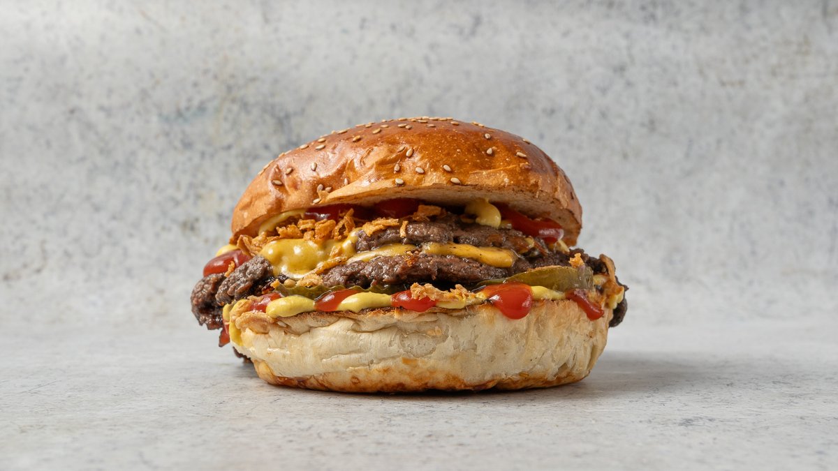 Dupla Angus marhahúspogácsa cheddar sajttal összesütve, jégsaláta, csemege uborka, lilahagyma dzsem, BUBU burgerszósz