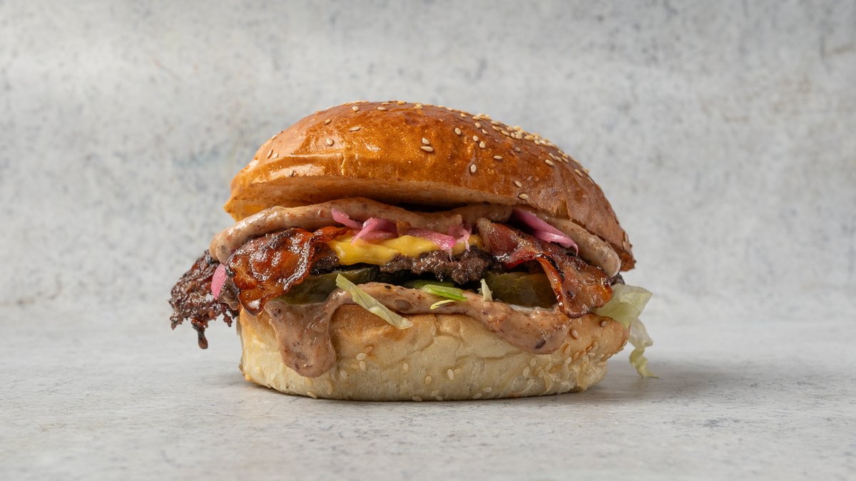 Tripla Angus marhahúspogácsa / 390g /, tripla cheddar, tripla bacon, jégsaláta, csemege uborka, lilahagyma dzsem, választható házi szósz