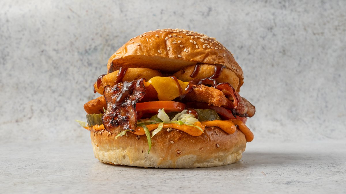 Kézműves csirke schnitzel, füstölt gouda, dupla bacon, ropogós hagymakarika, jégsalata, paradicsom, füstölt paprikás aioli, BBQ szósz