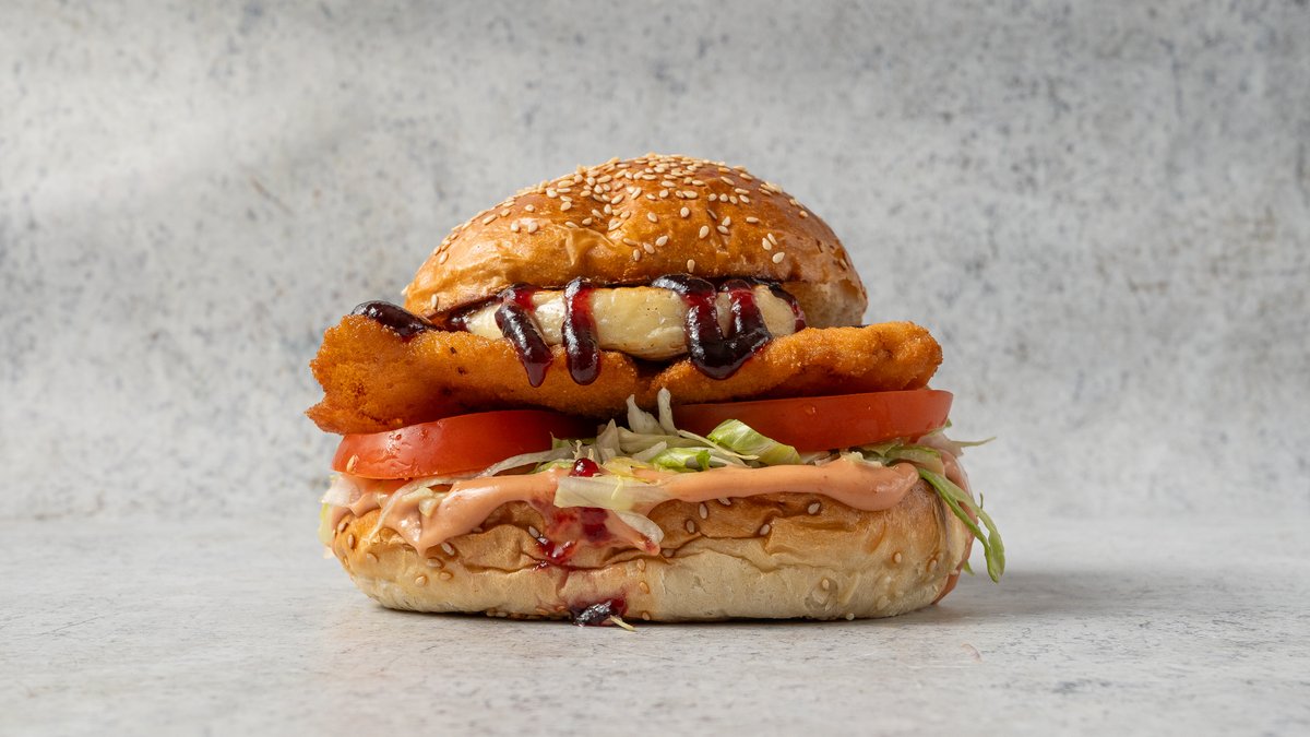 Kézműves csirke schnitzel, grillezett camembert, jégsaláta, paradicsom, BUBU burgerszósz, áfonya dzsem