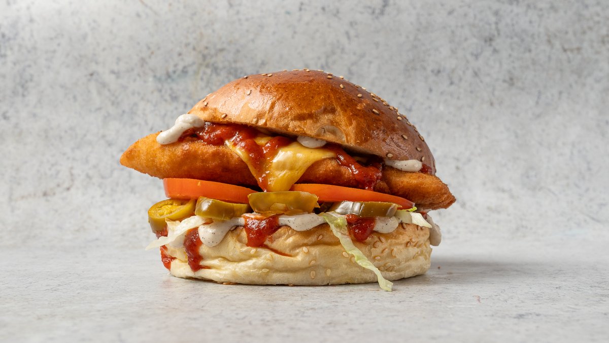 Kézműves csirke schnitzel, cheddar, jégsaláta, jalapeno, paradicsom, fokhagymás majo, házi chilliszósz