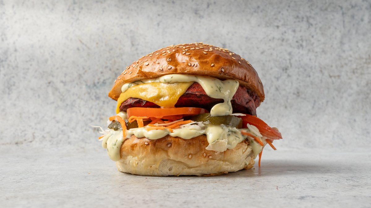 Cékla pogácsa, cheddar, káposzta slaw, csemege uborka, paradicsom, mézes mustáros kapros majonéz