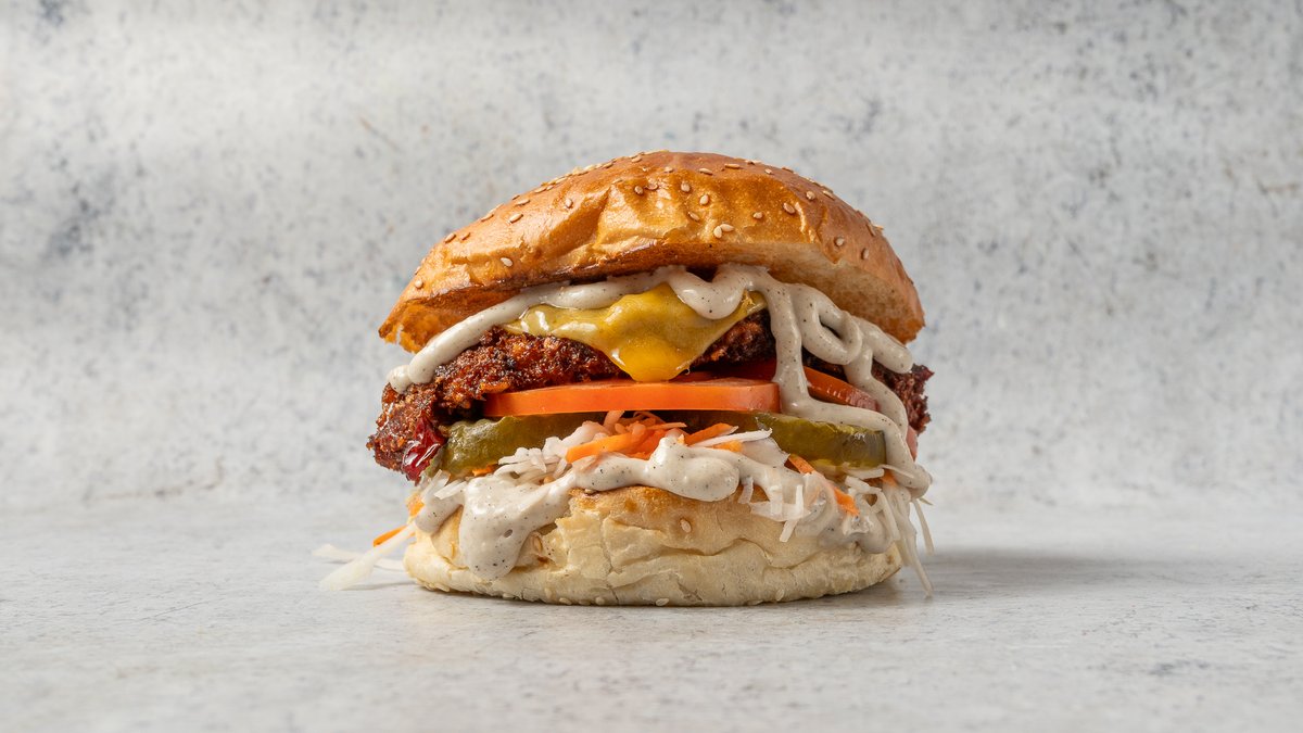 Kézműves csirkemell schnitzel, cheddar, káposzta slaw, paradicsom, gyömberes édes chilliszósz, fokhagymás majonéz