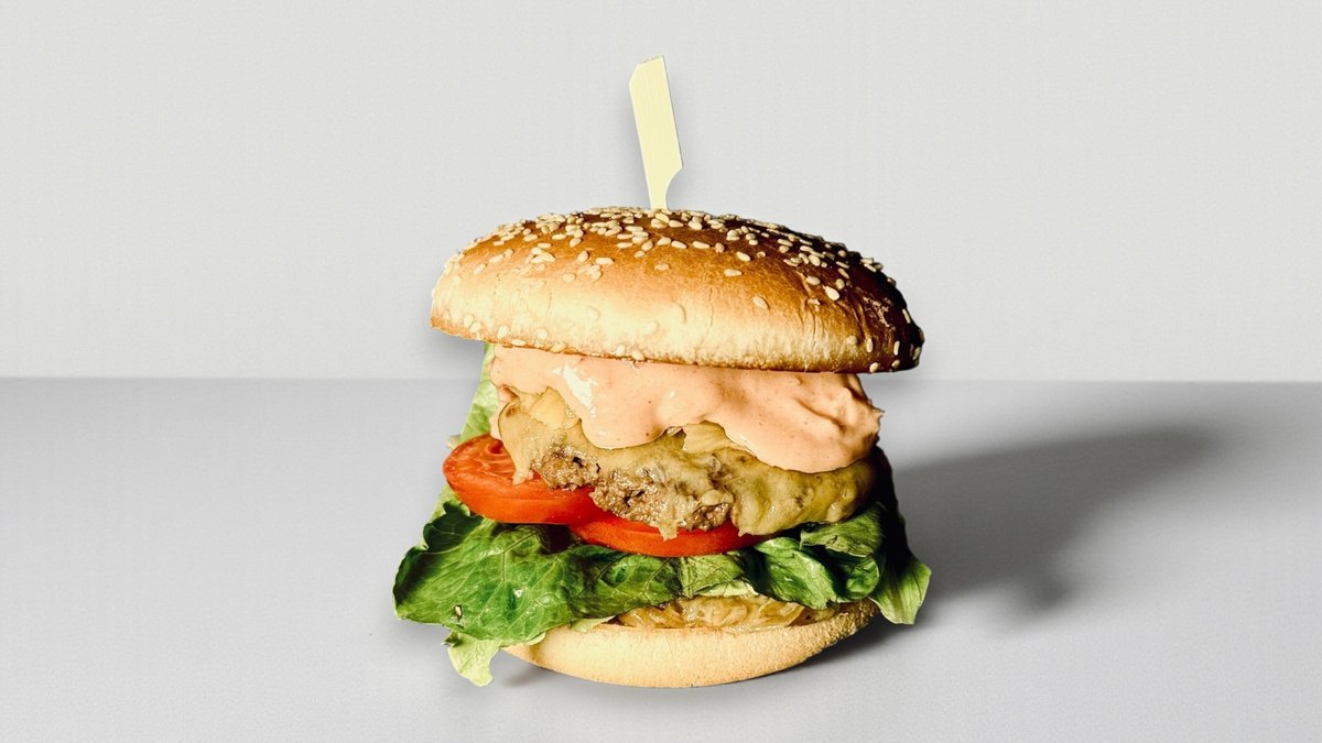 Szezámos zsemle, marhahús, cheddar sajt, mustáros hagyma, római saláta, paradicsom, házi hamburgerszósz