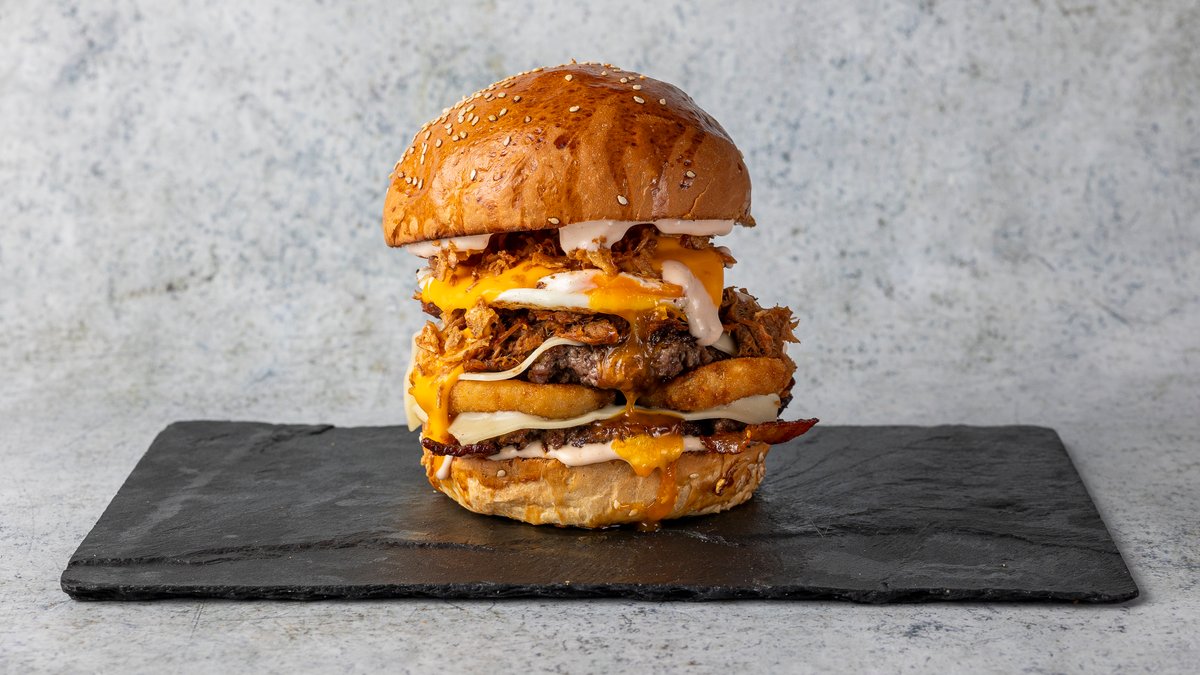 szezámmagos buci, dupla marhahúspogácsa, pulled pork tépett sertéshús, dupla grillezett bacon, dupla edámi sajt, 3 hagymakarika, tükörtojás, olvasztott cheddársajt, hamburgerszósz, savalított uborka, pirított hagyma