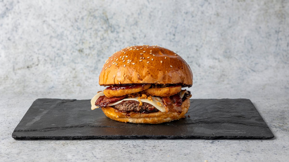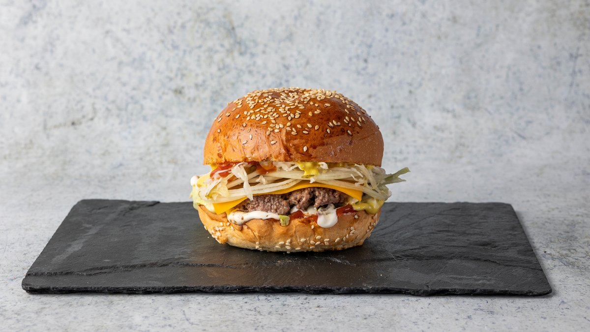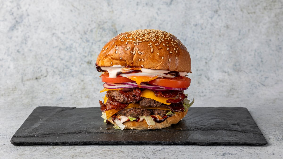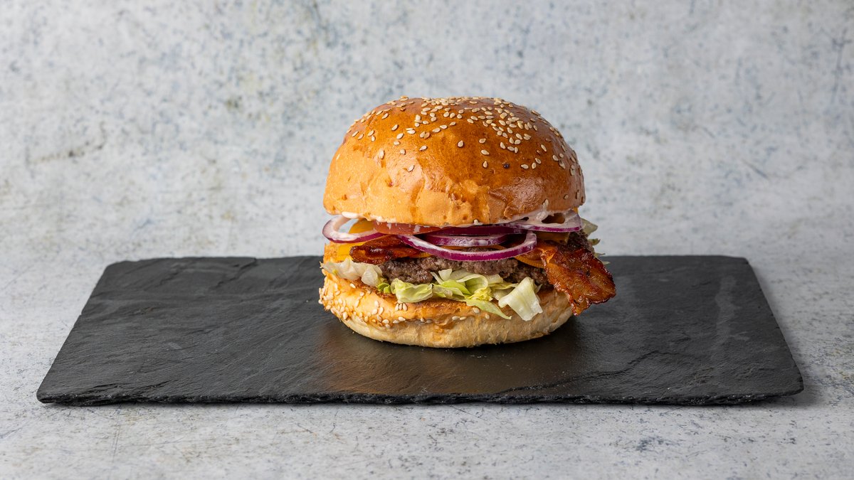 szezámmagos buci, marhahús, cheddar sajt, dupla adag grillezett bacon, friss saláta, paradicsom, lila hagyma, savanyú uborka, hamburgerszósz