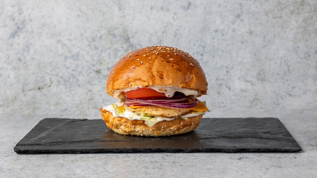 szezámmagos buci, grillezett csirkemell, cheddar sajt, friss saláta, paradicsom, lila hagyma, majonéz