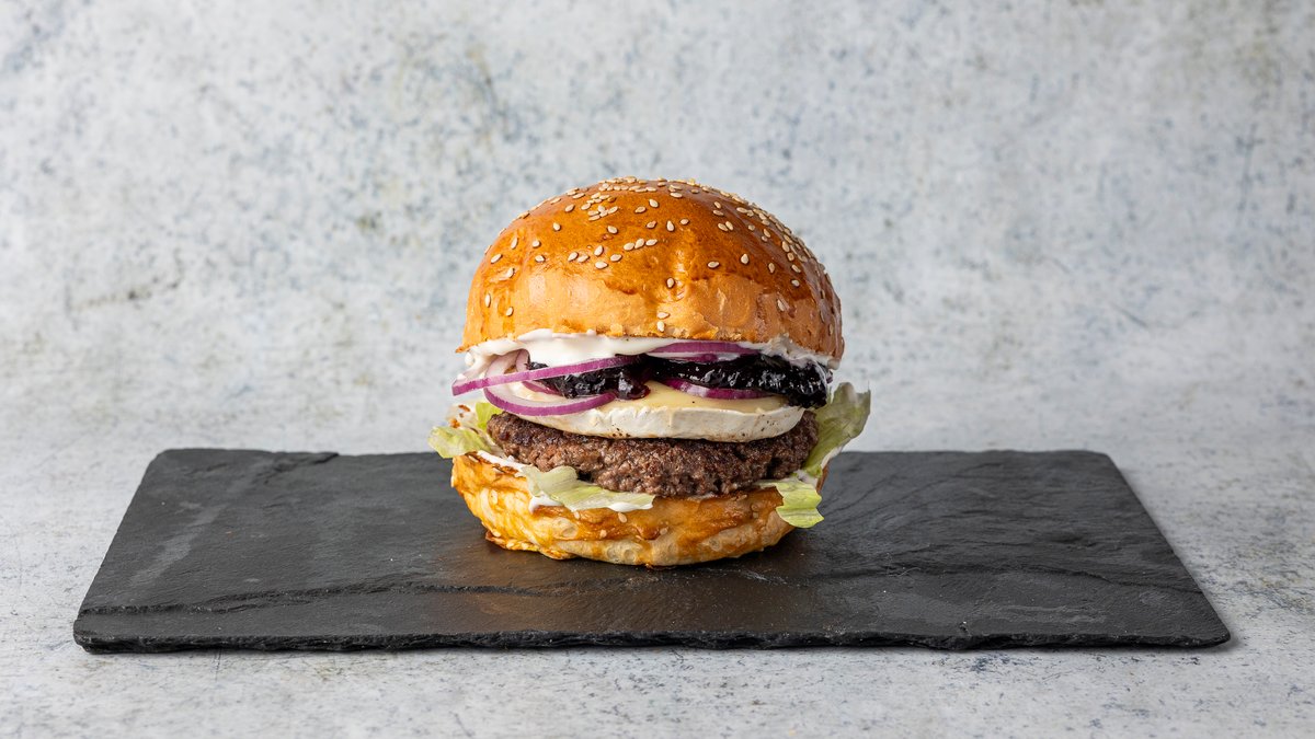 szezámmagos buci, marhahús, grillezett camembert sajt, friss saláta, lilahagyma, áfonyalekvár, pirított hagyma majonéz