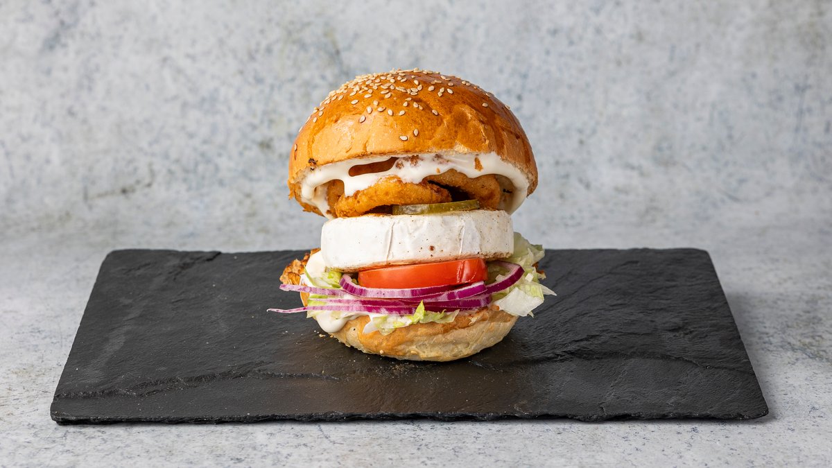 szezámmagos buci, egész camambert sajt, friss saláta, hagymakarika, savanyított uborka, paradicsom, lilahagyma, majonéz