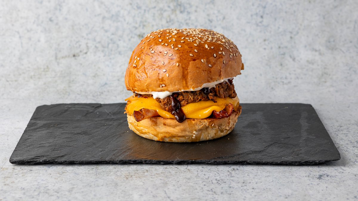 szezámmagos buci, marhahús, tépett-füstölt pulled pork sertéshús, dupla adag cheddar sajt, dupla adag grillezett bacon, pirított hagyma, majonéz, BBQ szósz, savanyított uborka