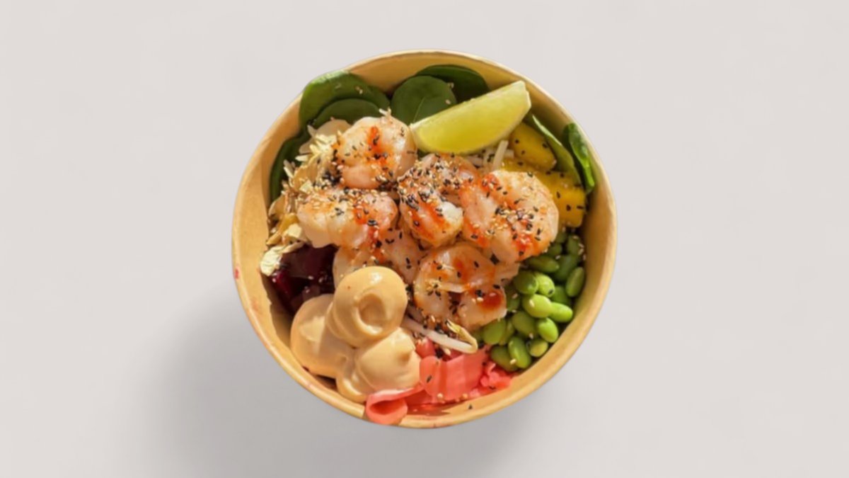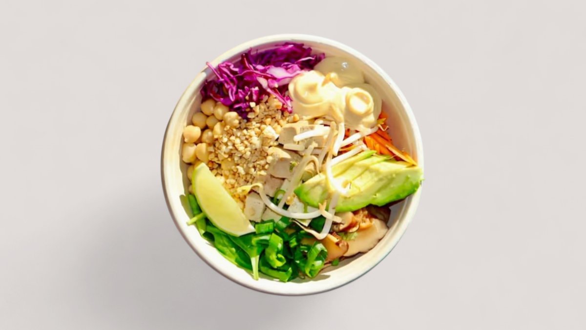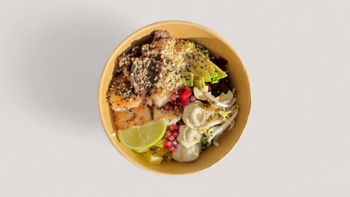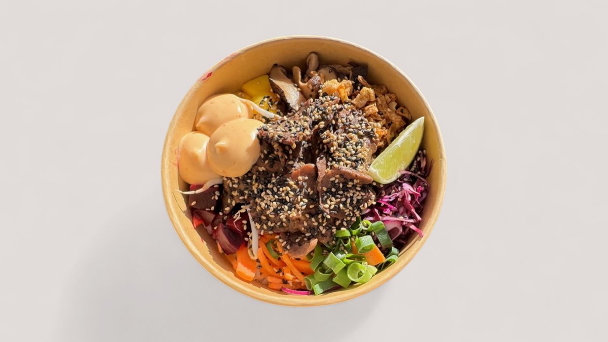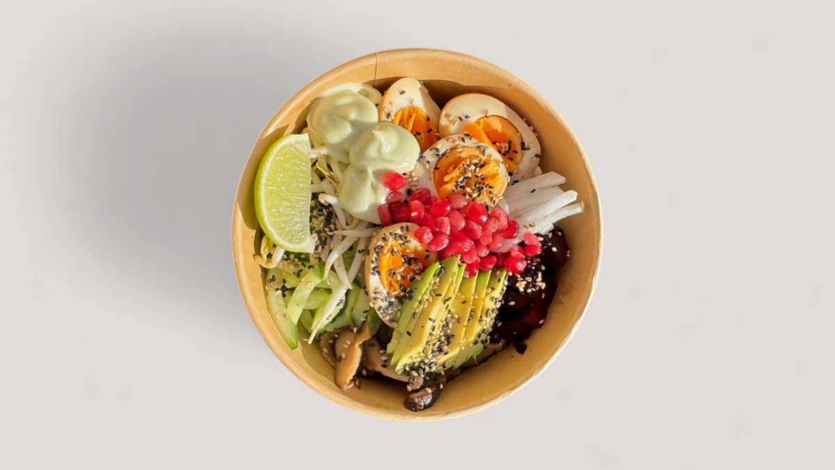 Választható alap, választható protein, cékla, fokhagymás spenót, daikon (japán retek), lilakáposzta, mangó, tamago (japán omlett), mungócsíra, szezám-mix, fokhagyma chips, koriander, dió, kék majonéz (blue spirulina), ponzu