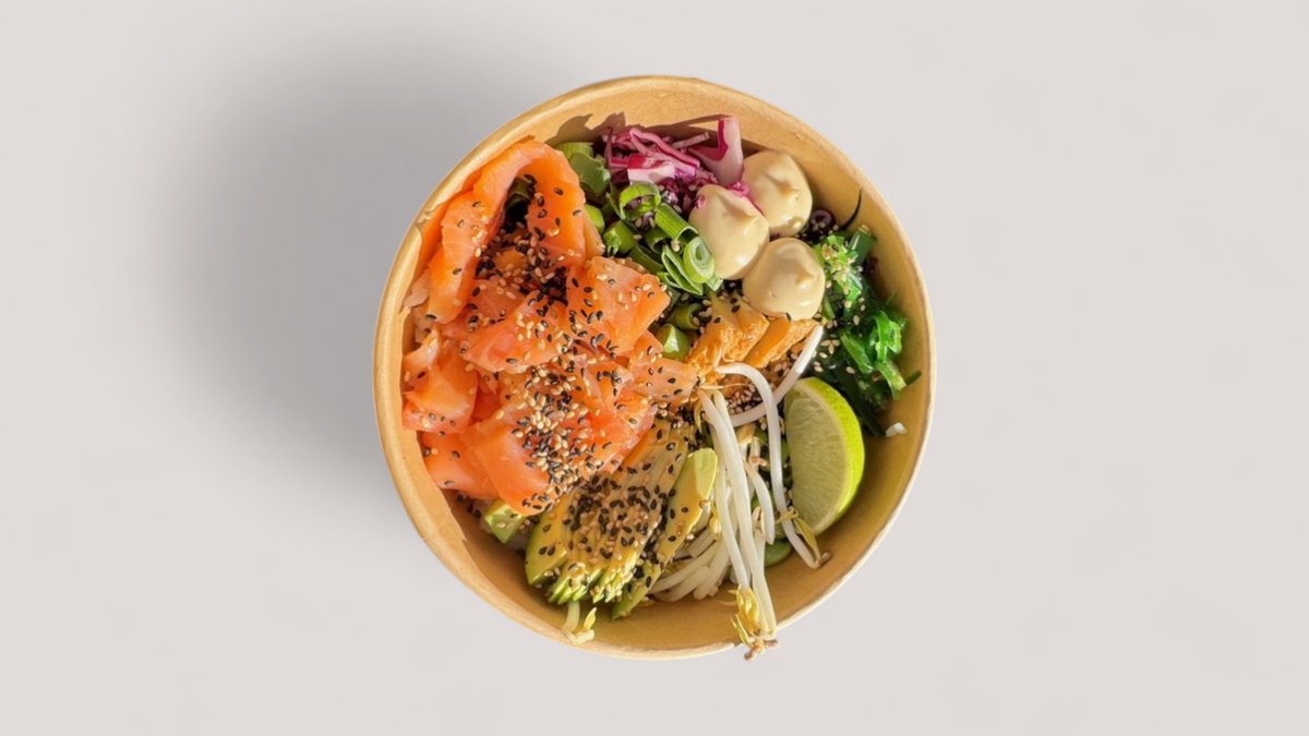 Füstölt lazac, tamago, uborka, wakame, lilakáposzta, avokádó, szezám mix, újhagyma, mungóbabcsíra, ponzu, japán majonéz, wakame, szezámmag