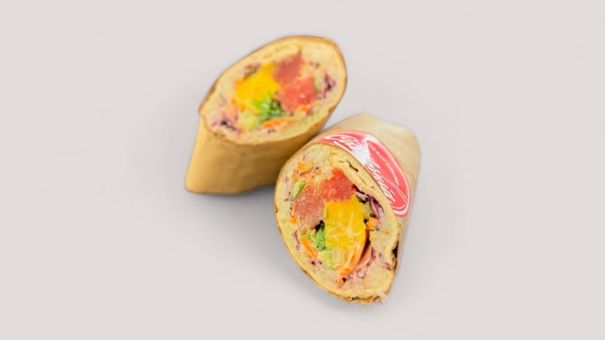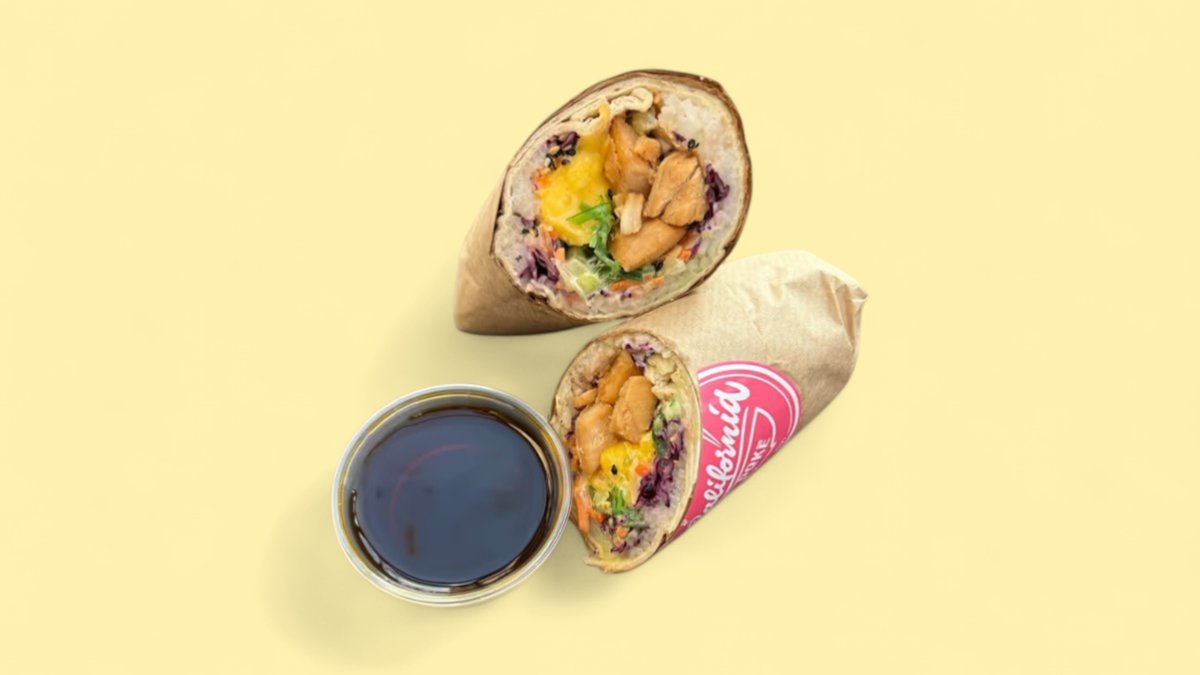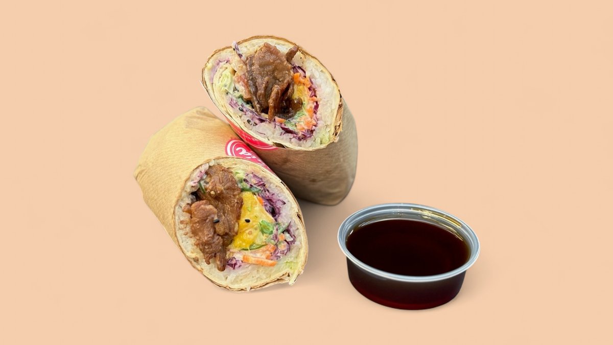 Omlós teriyaki marha, wrap, sushi rizs, wakame, uborka, lilakáposzta, sárgarépa, mangó, szezám-mix, mandula, választható, szószok