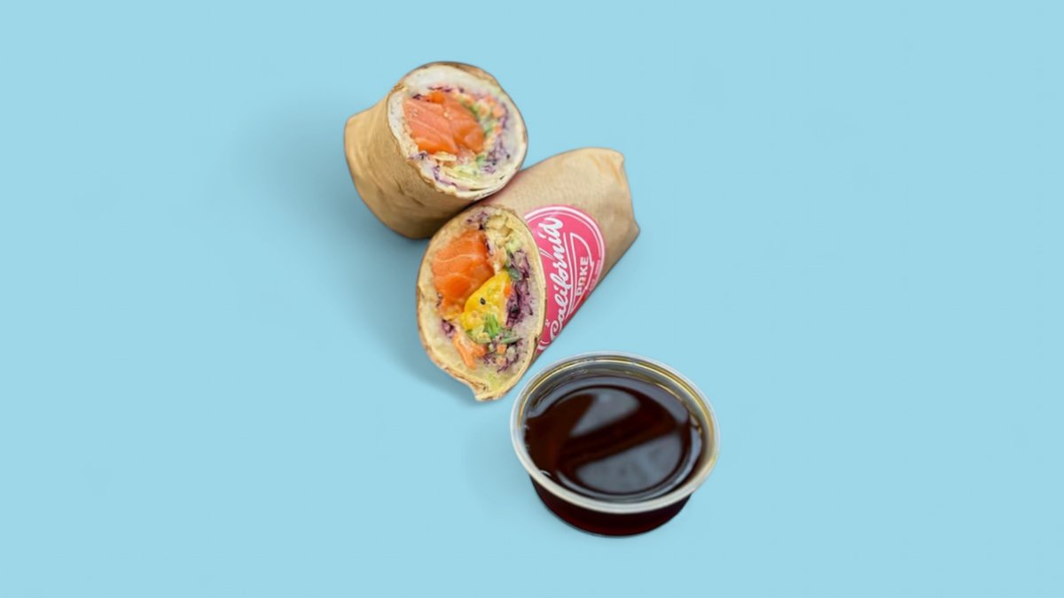 Friss lazac, wrap, sushi rizs, wakame, uborka, lilakáposzta, sárgarépa, mangó, szezám-mix, mandula, választható szószok