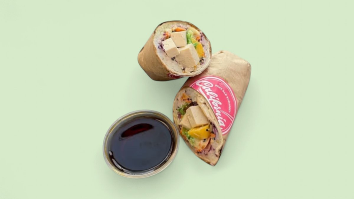 Tofu, wrap, sushi rizs, wakame, uborka, lilakáposzta, sárgarépa, mangó, szezám-mix, mandula