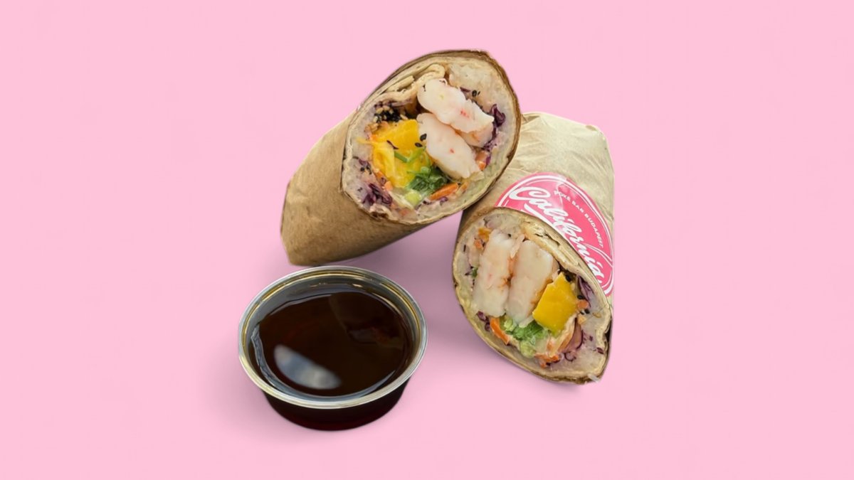 Sült garnéla, wrap, sushi rizs, wakame, uborka, lilakáposzta, sárgarépa, mangó, szezám-mix, mandula, választható szószok