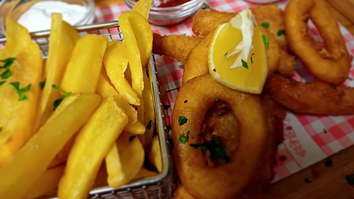 Pankó morzsában sült rákfarok (3db.), bundázott tintahal karika (3db), rántott tőkehal filé (1db), sült burgonya és mártások (ketchup, majonéz, fokhagymás tejföl)