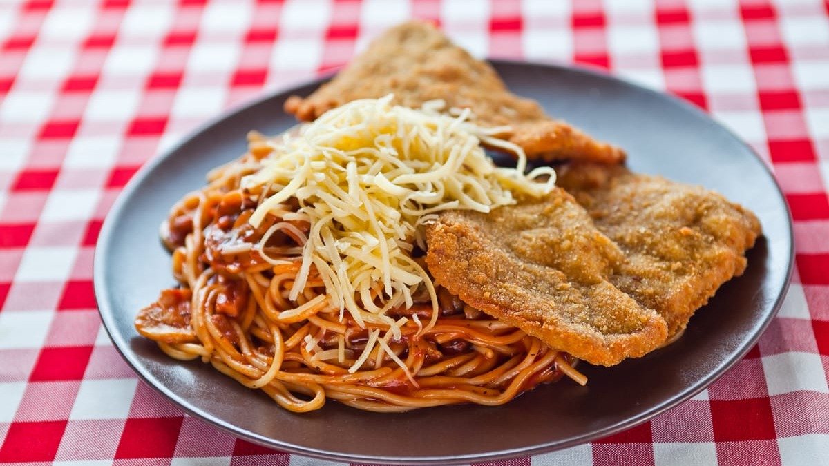 Ropogós panírban sült sertéskaraj (2 szelet), milánói spagettivel tálalva, reszelt mozzarella sajttal