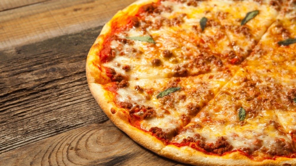 házi pizzaszósz, füstölt tarja, kolbász, bacon, bolognai ragu, lila hagyma, mozzarella sajt