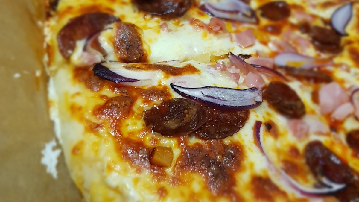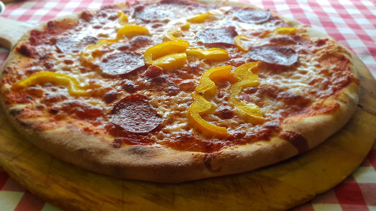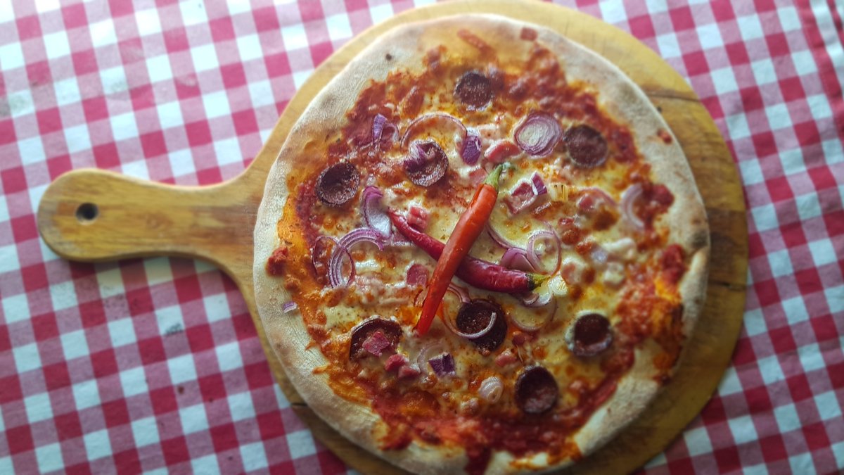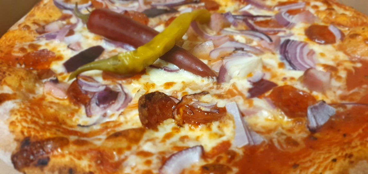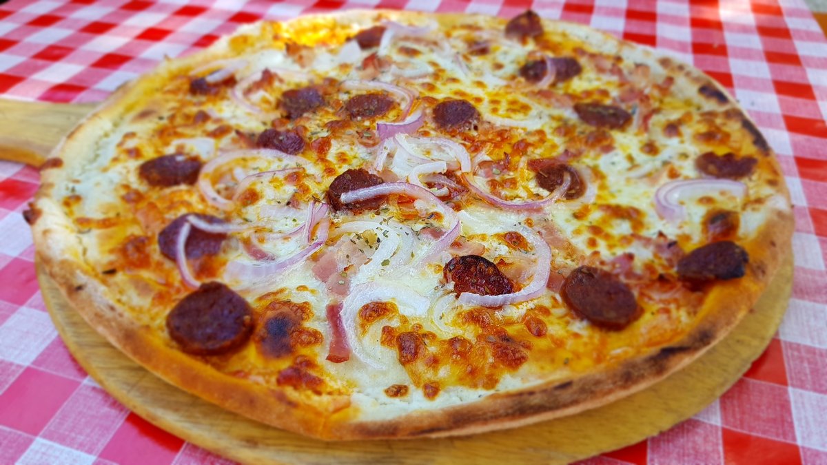 Házi pizza szósz, füstült-főtt tarja, kolbász, lilahagyma, pfefferoni paprika, mozzarella