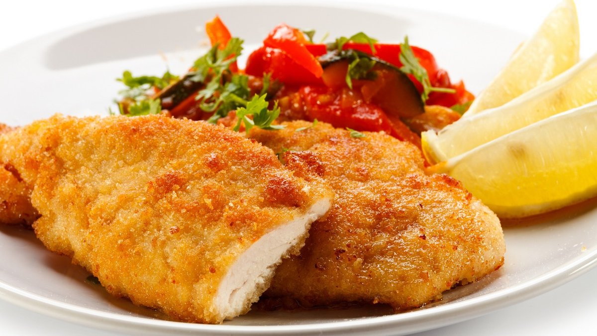 Kézzel reszelt házi kenyérmorzsában sütve, sült burgonyával