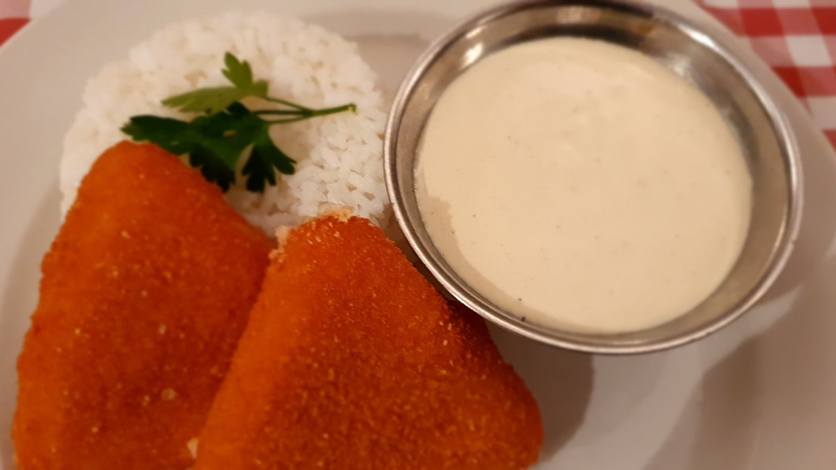 Fekete tőkehalfilé ropogós házi panírban sütve (2-3 szelet, súlytól függően), sült burgonyával. A "Remoulade" mártást majonézzel, finomra vágott hagymával, finomra vágott uborkával, és reszelt főtt tojással készítjük, tárkonyos ízesítéssel.