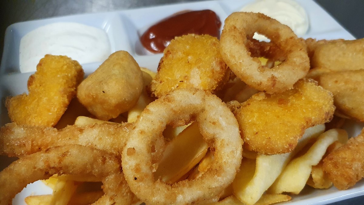 Csirke nuggets (3db.), Bundázott cheddar sajtfalatok (3db), rántott hagymakarika (3db.), Pankó morzsában sült rákfarok (2db.), sült burgonya, mártások (majonéz, ketchup, fokhagymás tejföl)