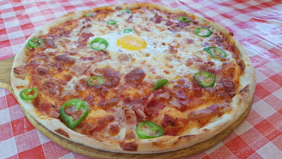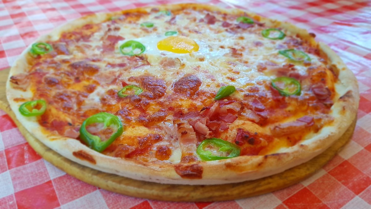 Házi pizza szósz, bacon, tojás, zöld paprika, mozzarella