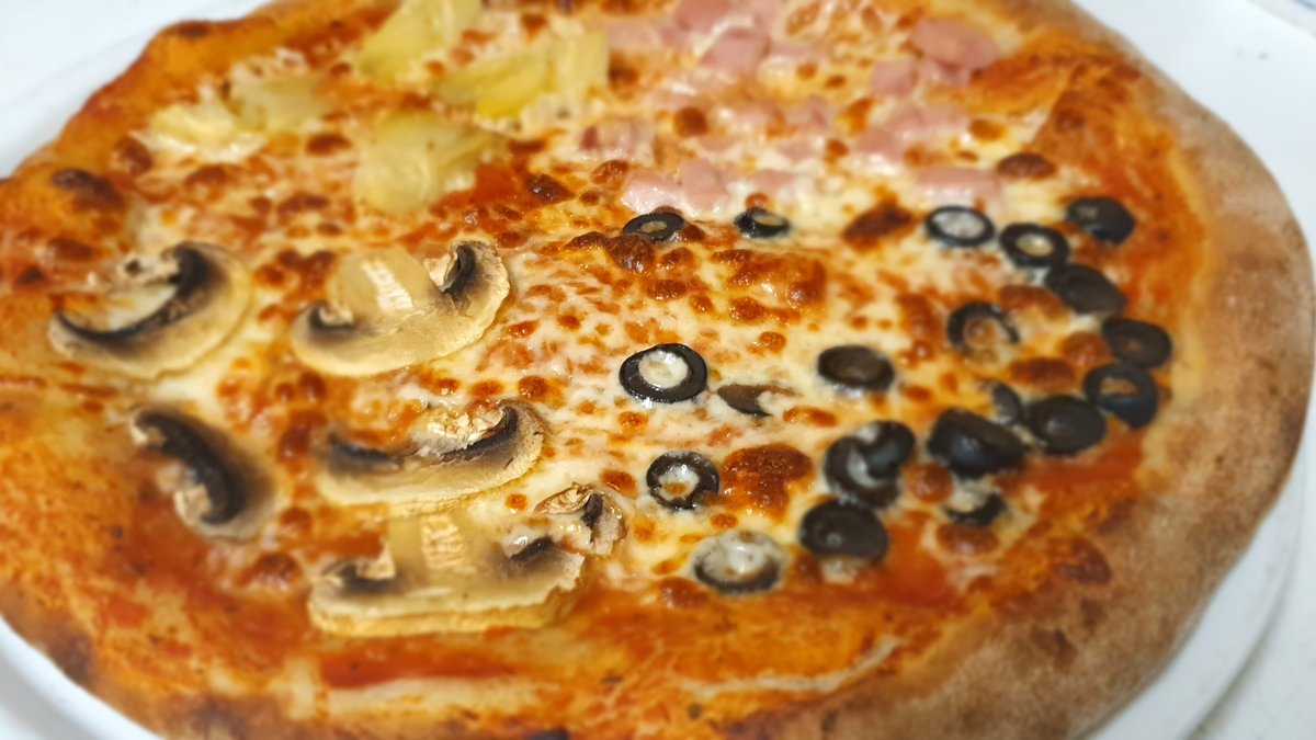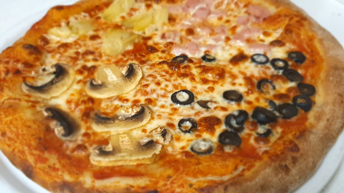 Házi pizza szósz, sonka, olívabogyó, gomba, articsóka, mozzarella