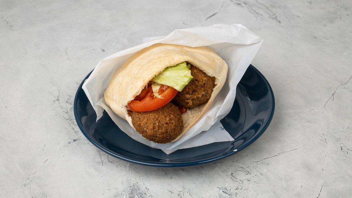 pita, jégsaláta, paradicsom, hagyma, uborka. szósz, 3db falafel
