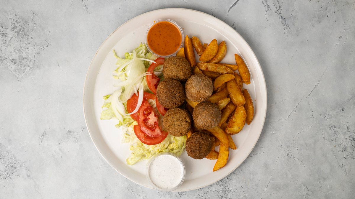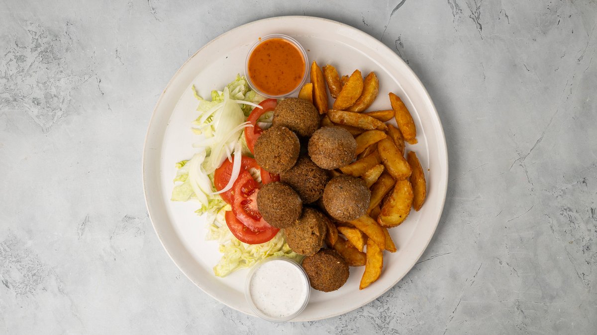 jégsaláta, paradicsom, hagyma, uborka. szósz, 8 falafel