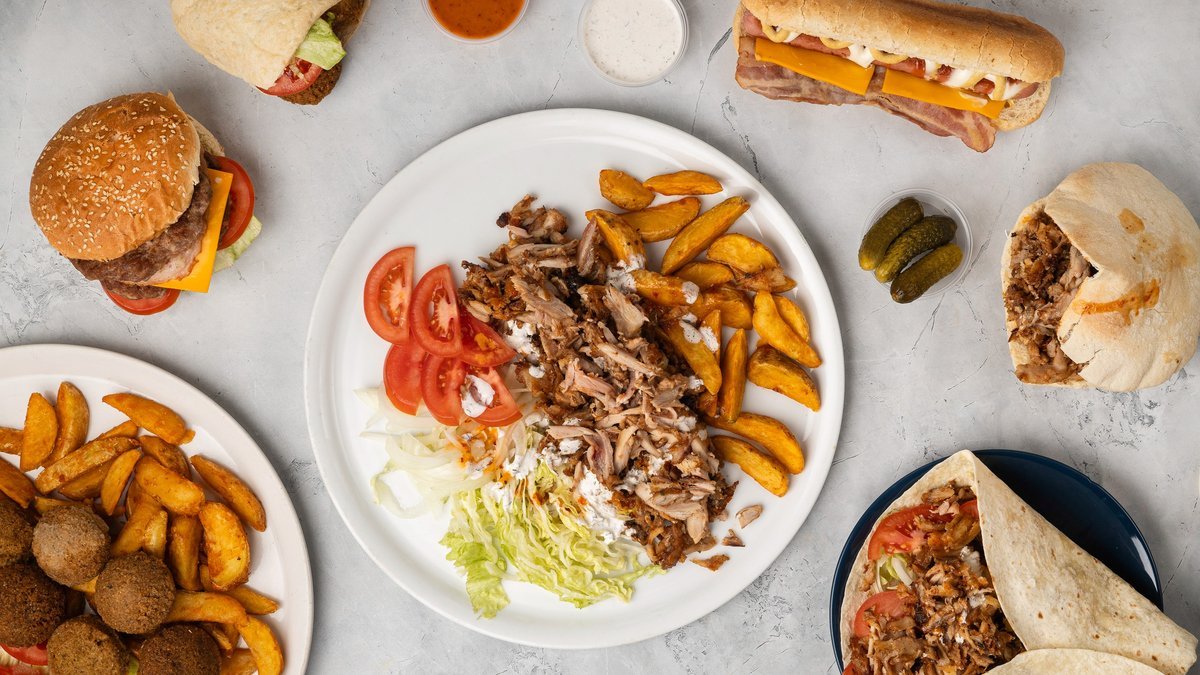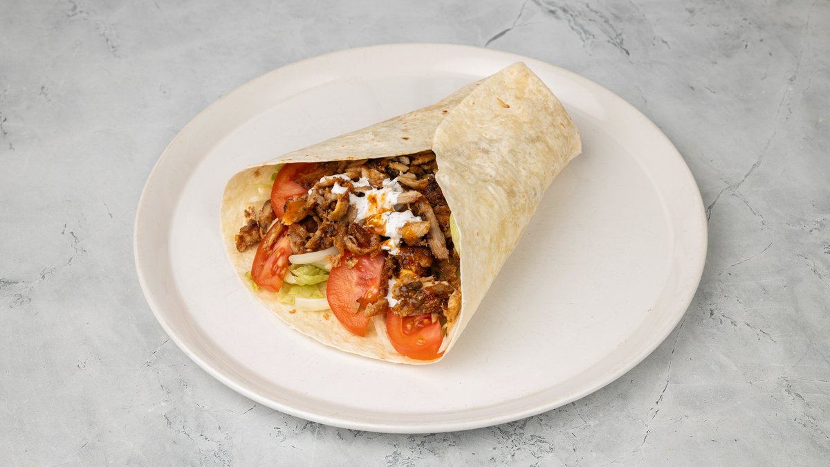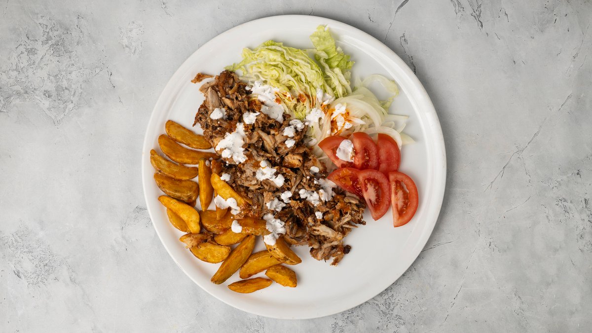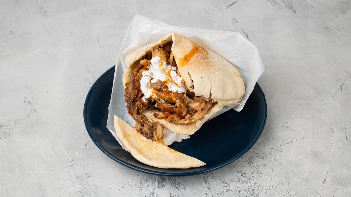 pita, hús, jégsaláta, paradicsom, hagyma, uborka. szósz