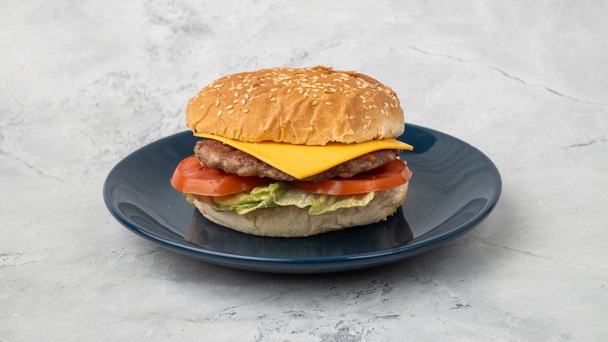1 db csirkehús pogácsa, saláta, hagyma, paradicsom, sajt, szószok