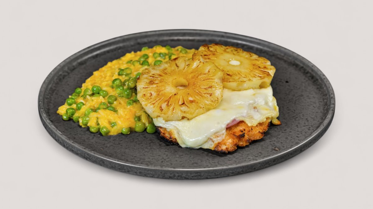 Rántott csirke sonkával, ananásszal és sajttal besütve chedar sajtos rizottóval