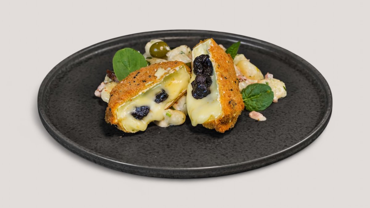 Rántott Camambert aszalt szilvával töltve tejszínes gnocchi