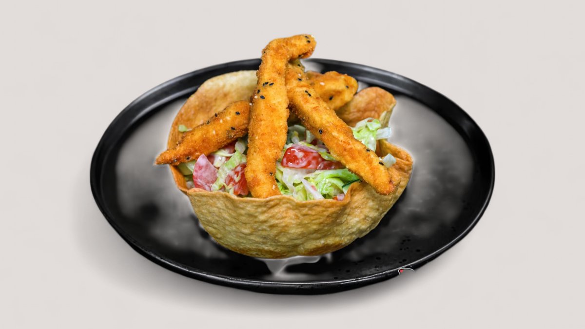 Tortilla kosárban szezámmagos rántott csirkecsíkok jégsaláta, uborka, paradicsom, joghurtos öntet