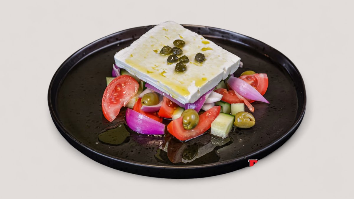 feta, paradicsom, uborka, lilahagyma, olívabogyó, kapribogyó, oregánó, olívaolaj