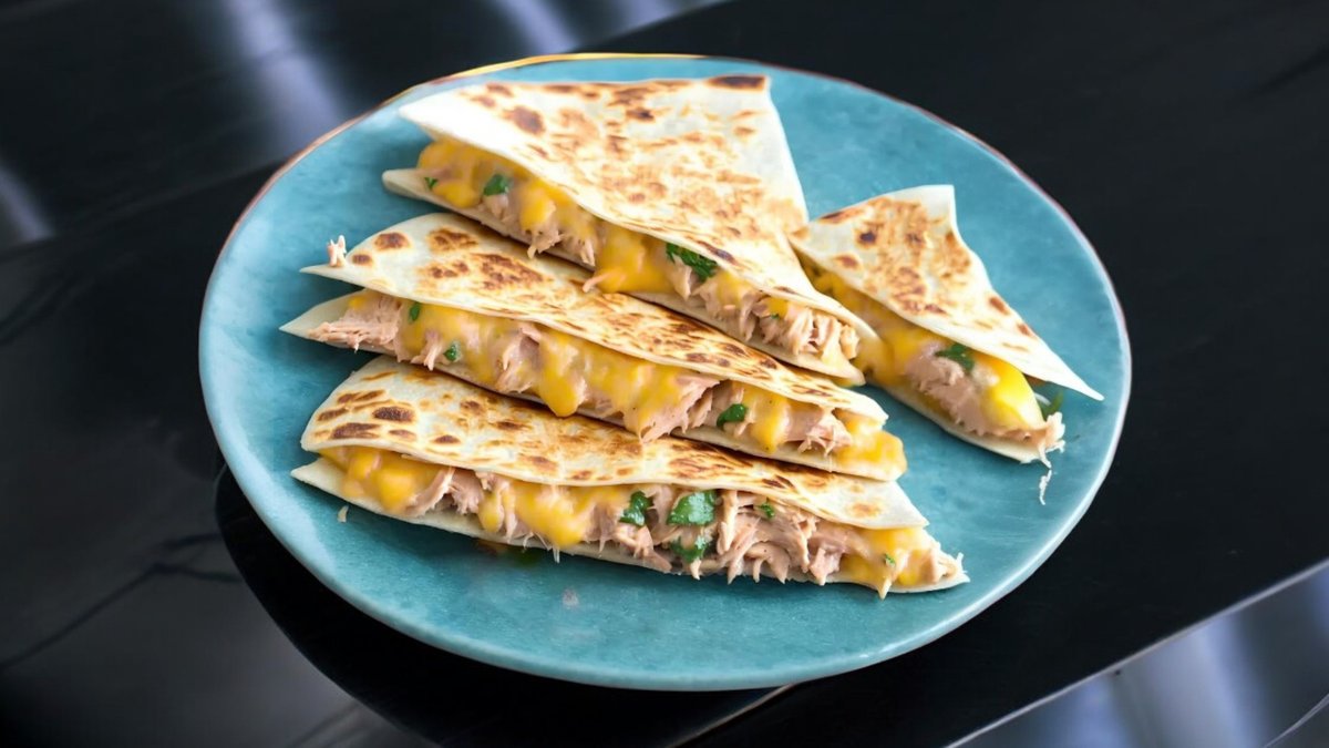 Grillezett búzatortilla olvasztott sajttal, omlós füszerescsirkével, kukoricával és tejföllel töltve.