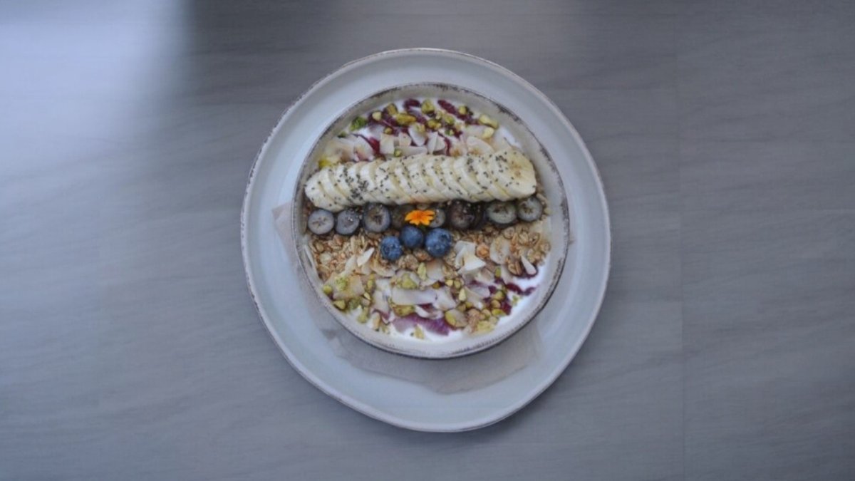 görög joghurt, banán, pekándió, pirított kókuszchipsz, chia mag, pisztácia, juharszirup allergén: glutén, tej, diófélék
