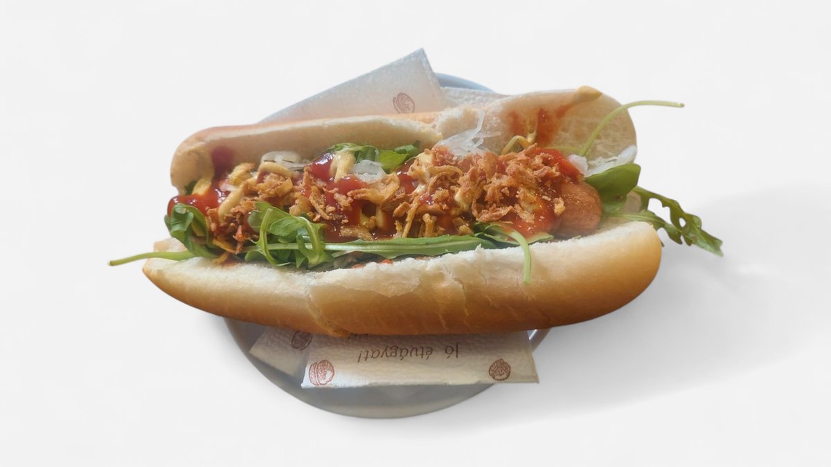 Savanyított káposzta, piritott hagyma, rukkola, mustár, alma ketchup