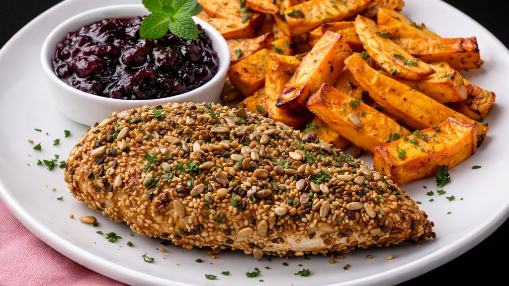 Sokmagvas bundában sült csirkemell filé, házi szederlekvárral,édesburgonyával