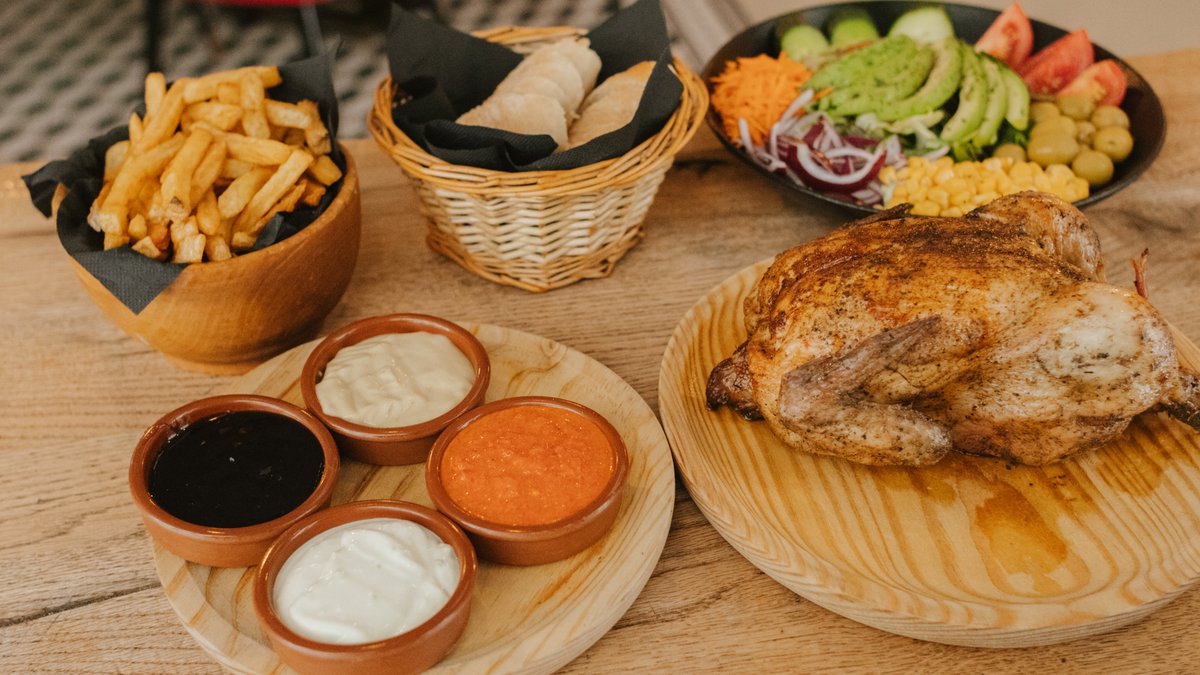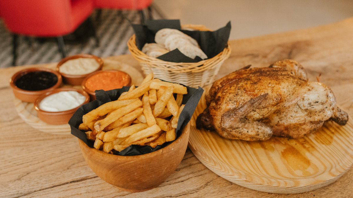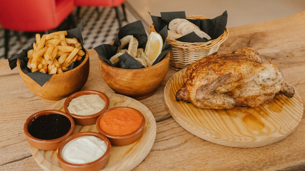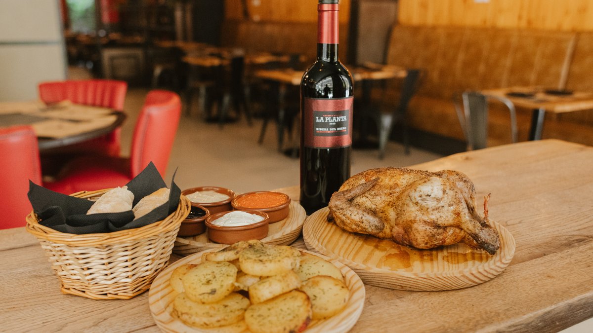 Egész csirke + krumpli + szósz + kenyér + 1 üveg La planta spanyol bor