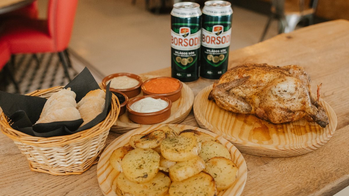 Egész csirke + krumpli + szósz + kenyér + 2x 0,5l sör