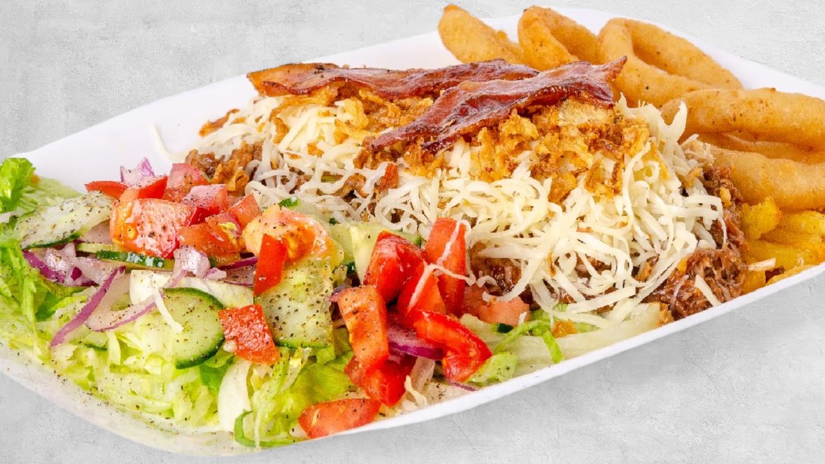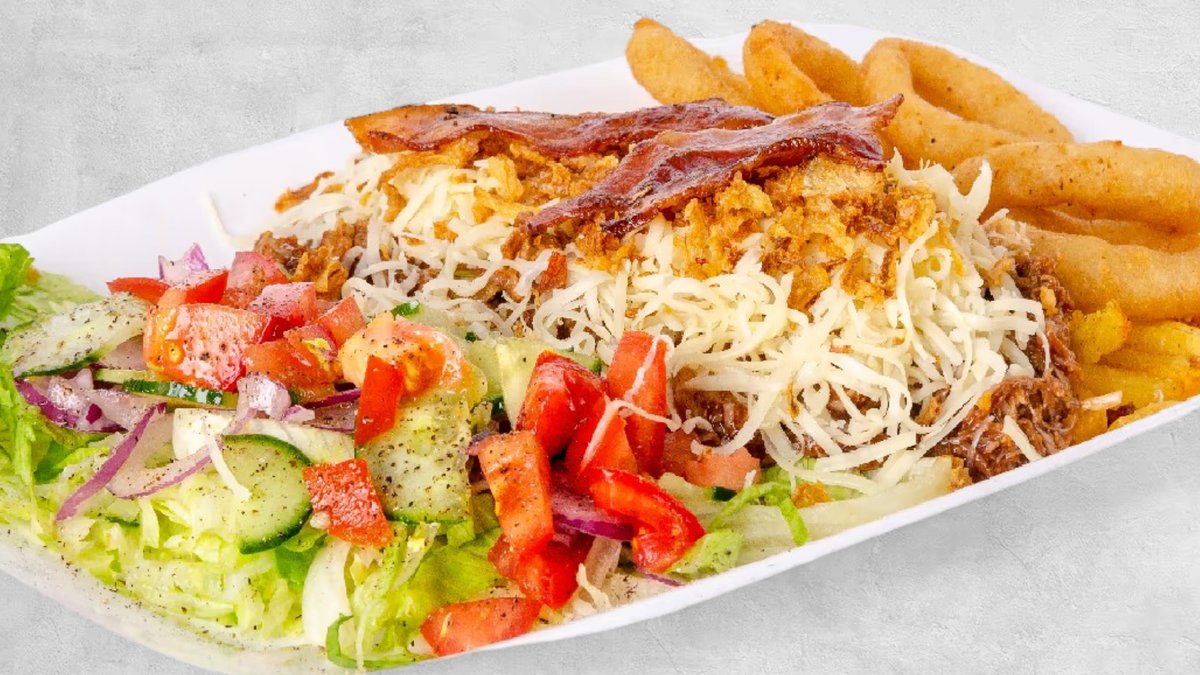 Pulled pork, friss saláta, hasábburgonya, 5 db hagymakarika,hasábburgonya BBQ szósz, reszelt sajt, bacon és pirított hagymaropogós – minden falatban tökéletes ízorgia. Füstös hús, ropogós köret és friss zöldségek tökéletes harmóniája – rendeld most! 🔥