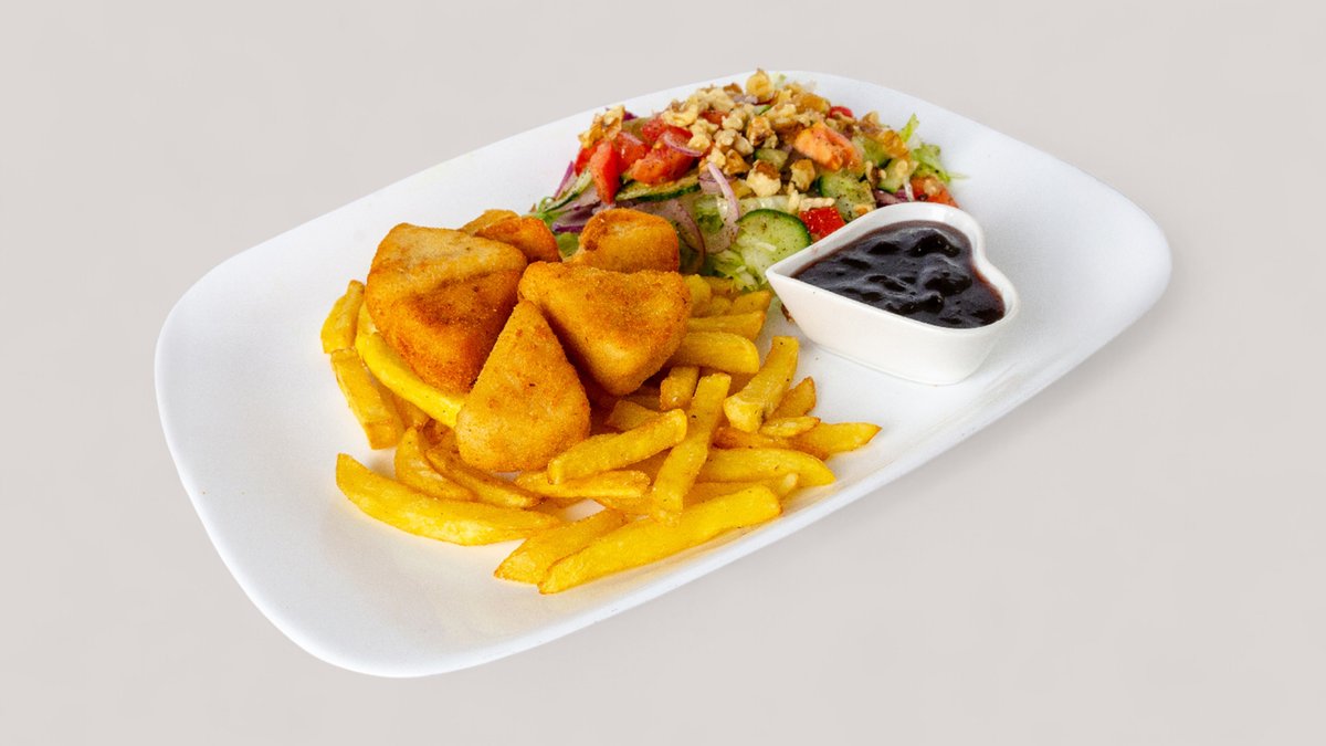 Ropogós, aranybarna csirke minden falatban! 6 db csirke nuggets, hasábburgonya és krémes majonéz tálalva – egyszerű, de ellenállhatatlan.Egy falat, és már repülsz az ízek világába – rendeld most! 🔥