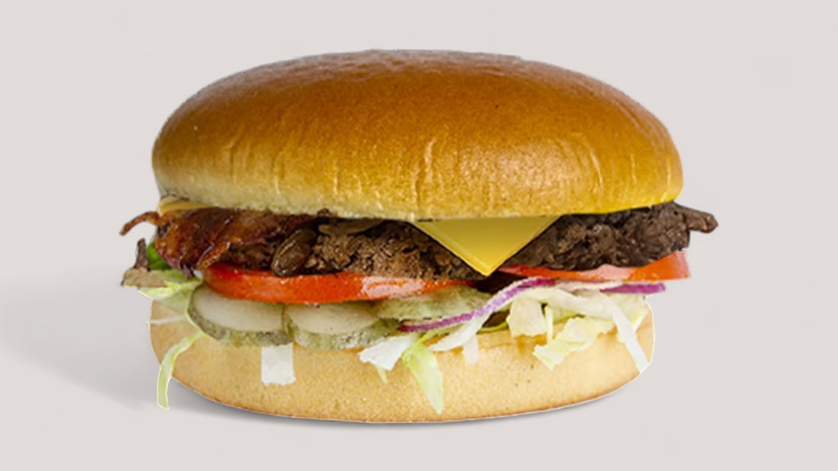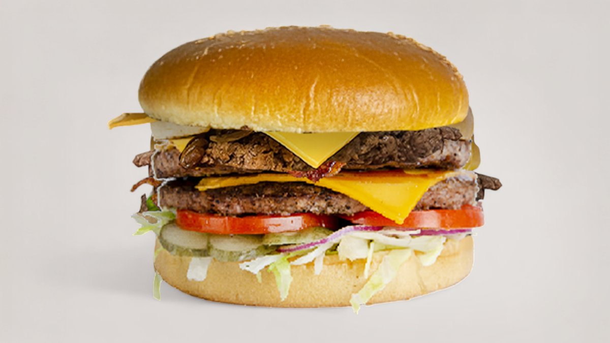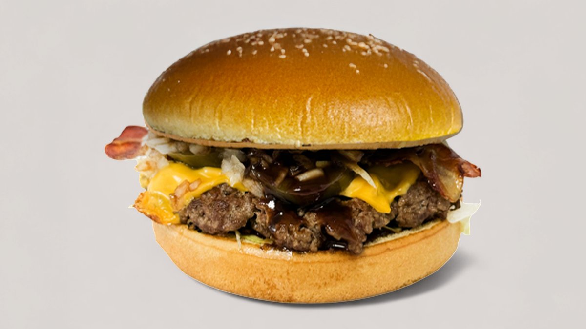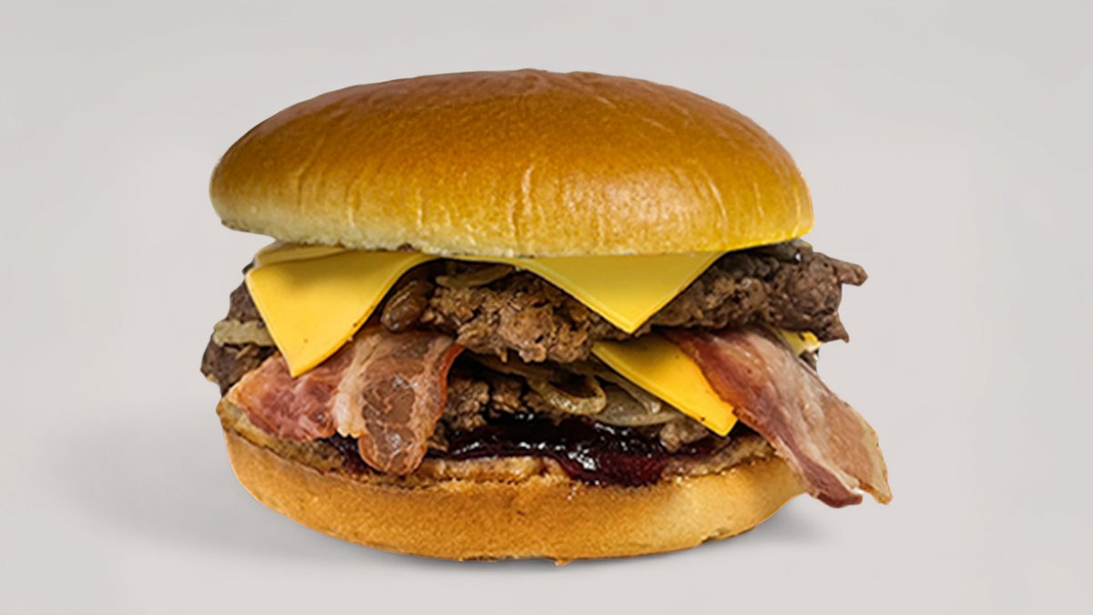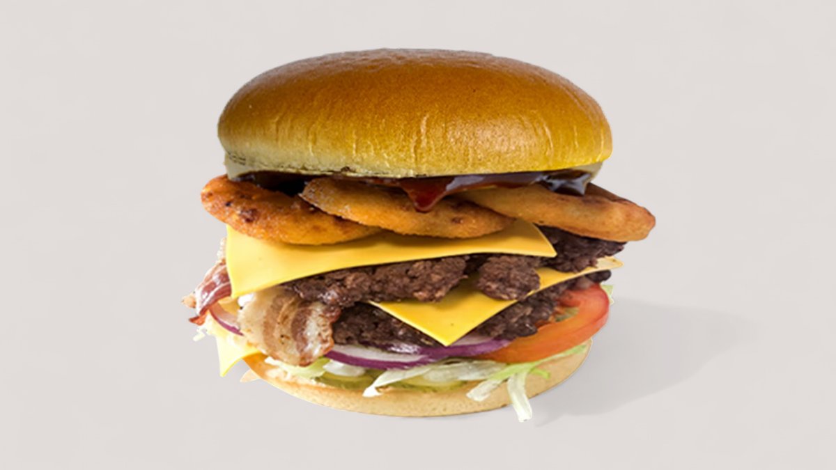 Egy igazi hússzörny, ami minden falattal kihívás! 2x 100% marhahúspogácsa, 3 ropogós hagymakarika, 2 lap olvadt cheddar sajt, bacon, jégsaláta, BBQ szósz, paradicsom, csemegeuborka és lila hagyma puha buciban. Hatalmas, szaftos és ellenállhatatlan – csak igazi húsimádóknak! 🔥