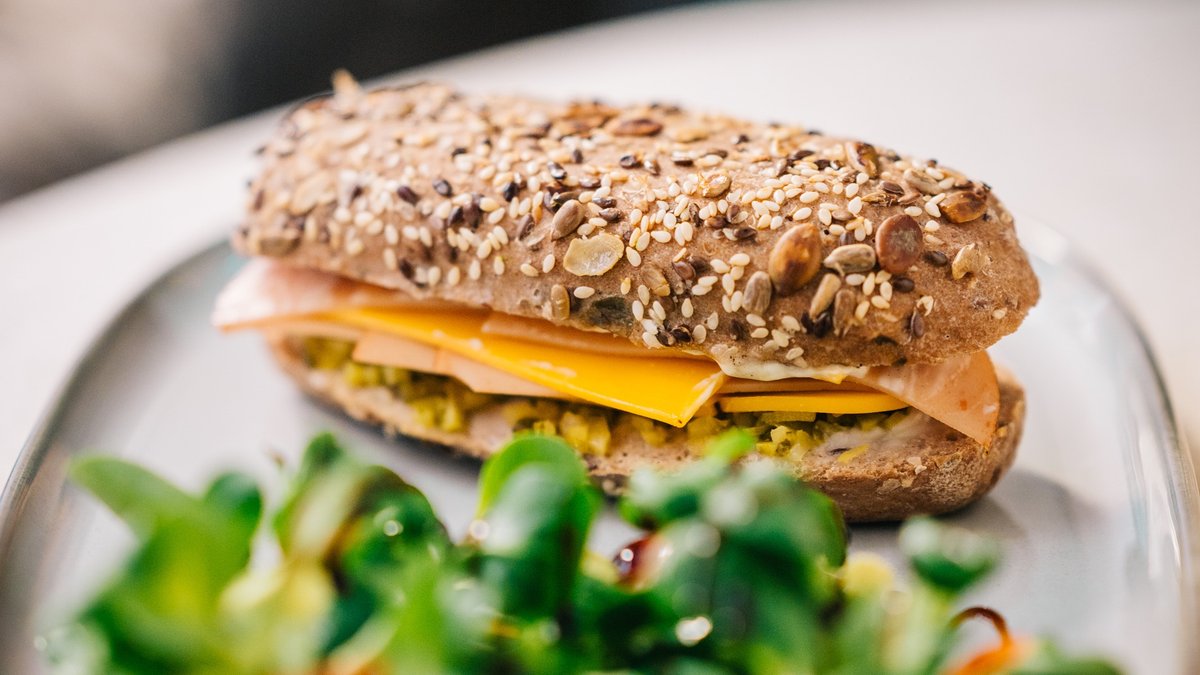 gluténmentes kenyér, vegán sajtkrém, veganéz, csemegeuborka, vegán cheddar, vegán sonka, díszítés: madársaláta, koktélparadicsom, balzsamecet