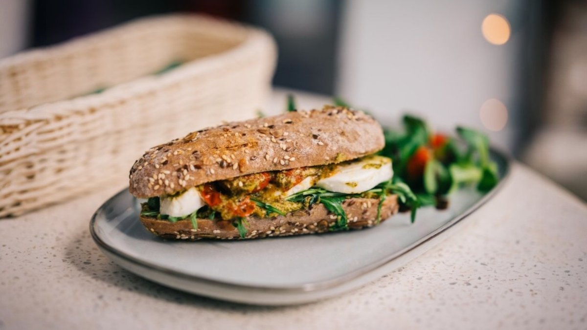 /gluténmentes hamburgerzsemle, csiperkegomba, vöröshagyma, fokhagymapor, gyömbér, szójaszósz, olívaolaj, agavészirup, vegán fetás-aszaltparadicsomos krém, paradicsom, spenót, mustár, oregánó, bazsalikom, díszítés: madársaláta, koktélparadicsom, balzsamecet/